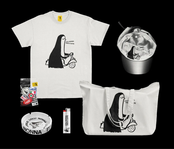 En detalj som sticker ut är den coolt rökande galjonsfiguren i logotypen. Hon är en av 18 AI-genererade illustrationer av italienska tanter som äter foccaccias och dricker vin. Den lilla tvisten att hon bär nunnedräkt (efter att vi först trodde att “nonna” betydde “nunna”) blev så bra att den nu är en central del av varumärket.