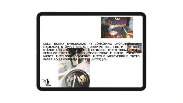 För att konvertera den unika upplevelsen av Lolli Nonna till ett starkt varumärke, valde vi en minimalistisk och luftig design som släpper fram innehållet – främst i form av egna foton som är knäppta med engångskameror. Ett annat viktigt element är typografin (Helvetica endast i VERSALER). Genom att låta alla textstycken dras ut till marginalen förvandlas även texterna till artwork.